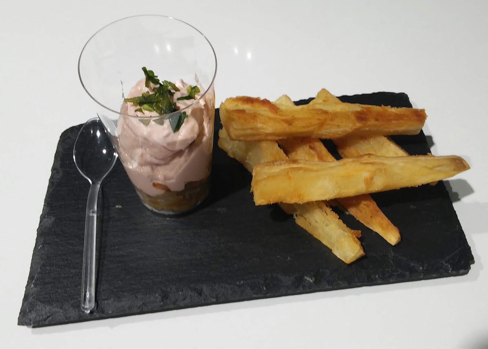 · Mousse de foie y cebollita caramelizada con yuca frita.
